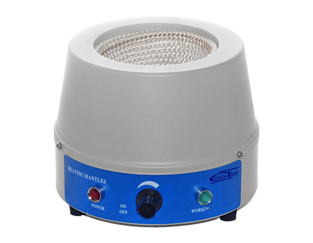 Płaszcz grzewczy z regulacją mocy. Typ - SXKW-981B. Urządzenie przeznaczone jest do prac laboratoryjnych i służy do podgrzewania różnego rodzaju cieczy. Wbudowany podzespół regulujący moc pobieraną, umożliwia nastawę żądanej temperatury. Zakres pracy płaszcza grzewczego + do 350°C. Napięcie znamionowe 220V AC 50 HZ. Obok regulatora mocy umieszczono czerwoną lampkę sygnalizującą pracę. Gdy pokrętło regulatora wskazuje „0” lampka jest zgaszona. Górną część zamyka pierścień stalowy, nadając całemu urządzeniu estetyczny wygląd. Płaszcz grzewczy wykonany jest zgodnie z normami UE i oznaczony znakiem CE.